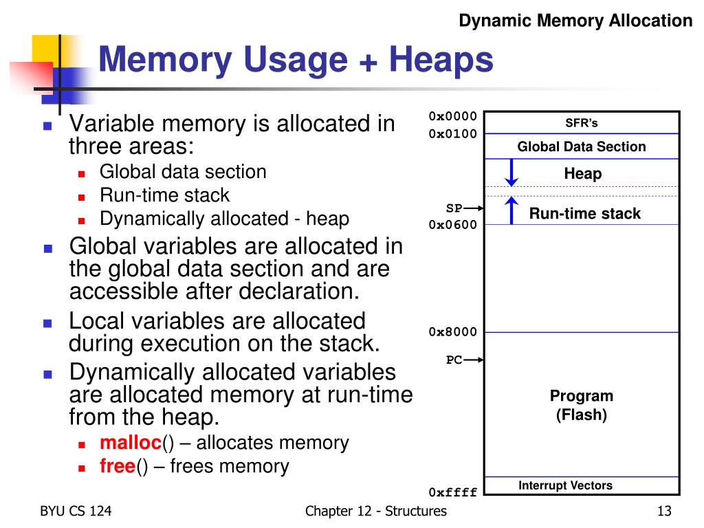 0x0100 Global Data Section Heap SP Run-time stack 0x0600 0x8000 Program (Flash) PC Interrupt Vectors Dynamic Memory Allocation Memory Usage + Heaps 0x0000 • Variable memory is allocated in three areas: • Global data section • Run-time stack • Dynamically allocated - heap SFR’s • Global variables are allocated in the global data section and are accessible after declaration. • Local variables are allocated during execution on the stack. • Dynamically allocated variables are allocated memory at run-time from the heap. • malloc() – allocates memory • free() – frees memory 0xffff Chapter 12 - Structures