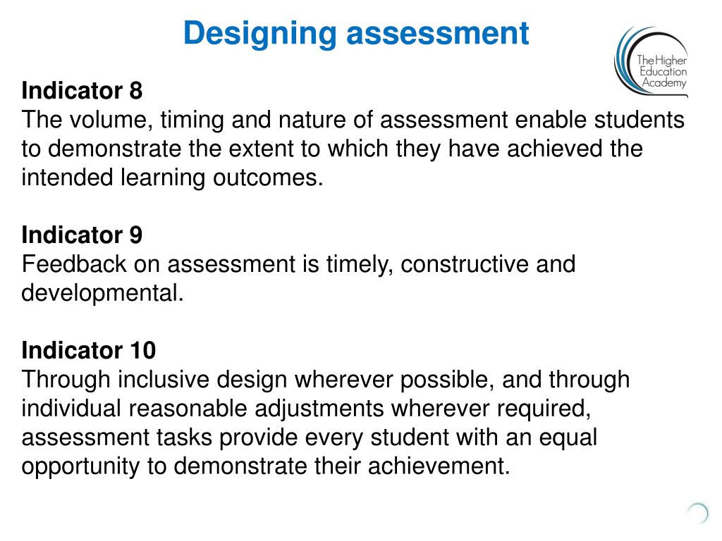 Designingassessment Indicator 8 The volume, timing and nature of assessment enable students to demonstrate the extent to which they have achieved the intended learning outcomes. Indicator 9 Feedback on assessment is timely, constructive and developmental. Indicator 10 Through inclusive design wherever possible, and through individual reasonable adjustments wherever required, assessment tasks provide every student with an equal opportunity to demonstrate their achievement.