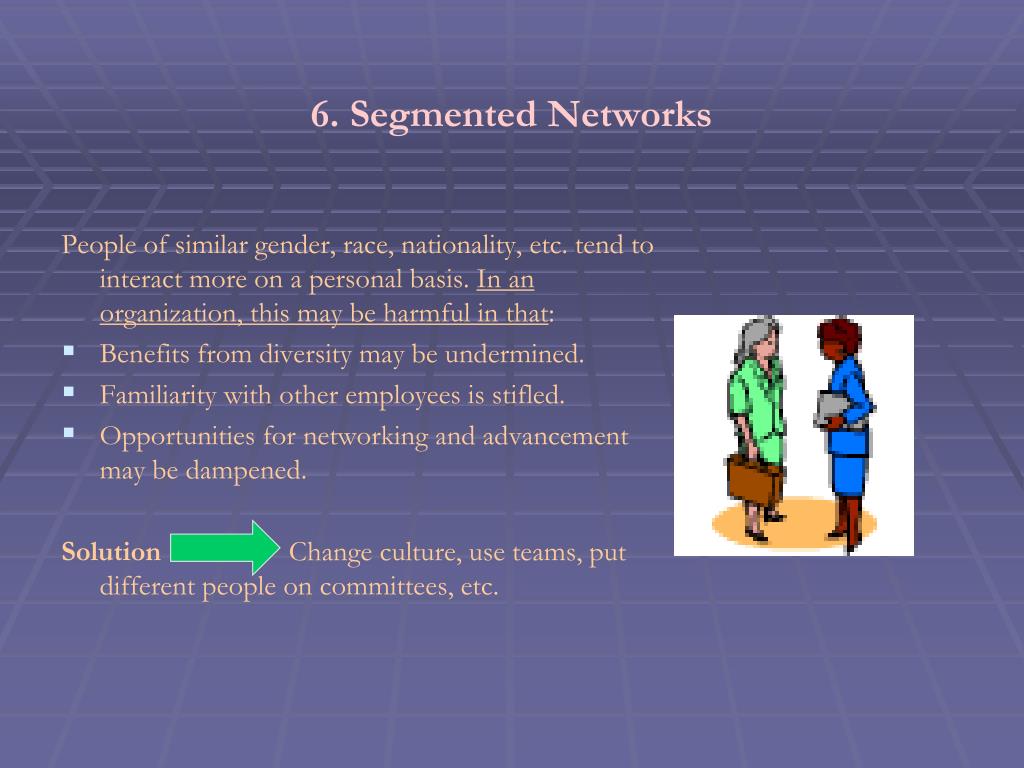 6. Segmented Networks People of similar gender, race, nationality, etc. tend to interact more on a personal basis. In anorganization, this may be harmful in that: • Benefits from diversity may be undermined. • Familiarity with other employees is stifled. • Opportunities for networking and advancement may be dampened. Solution Change culture, use teams, put different people on committees, etc.