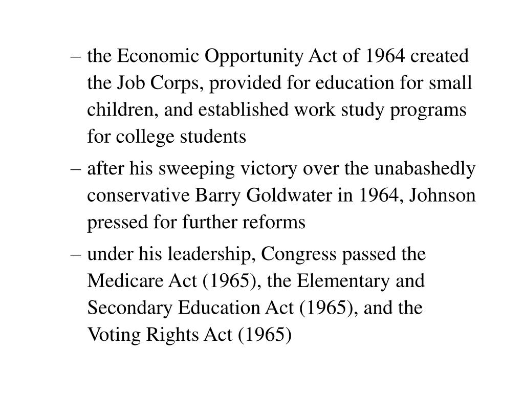 the Economic Opportunity Act of 1964 created the Job Corps, provided for education for small children, and established work study programs for college students • after his sweeping victory over the unabashedly conservative Barry Goldwater in 1964, Johnson pressed for further reforms • under his leadership, Congress passed the Medicare Act (1965), the Elementary and Secondary Education Act (1965), and the Voting Rights Act (1965)