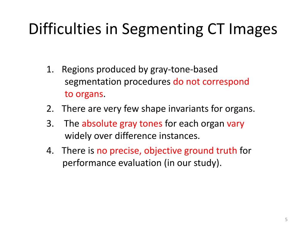 Difficulties in Segmenting CT Images Regions produced by gray-tone-based segmentation procedures do not correspond to organs. There are very few shape invariants for organs. The absolute gray tones for each organ vary widely over difference instances. There is no precise, objective ground truth for performance evaluation (in our study).