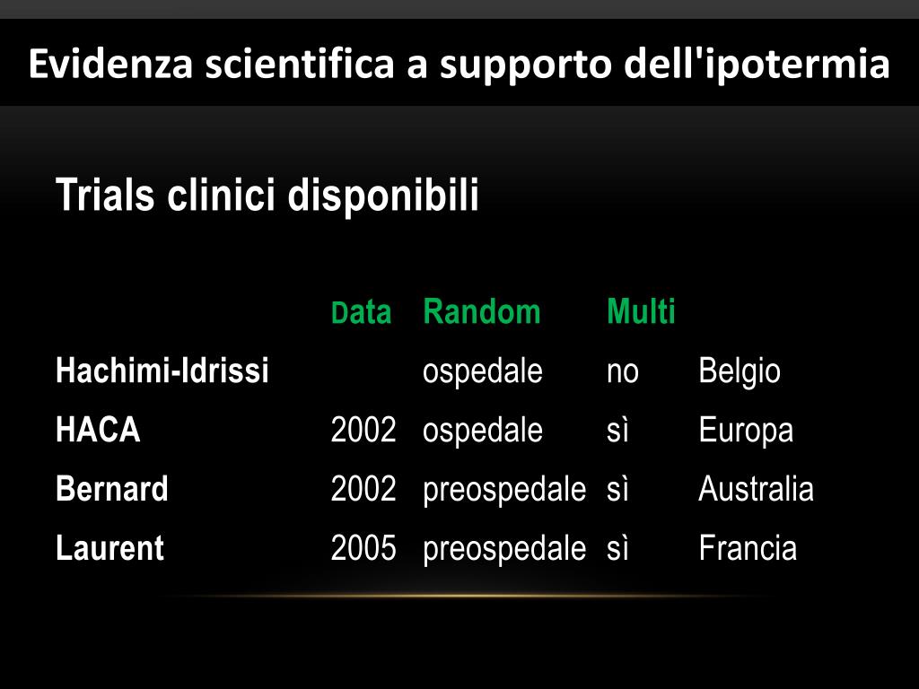 Trials clinicidisponibili Data Random Multi Hachimi-Idrissi2001 ospedalenoBelgio HACA 2002 ospedalesì Europa Bernard 2002 preospedalesìAustralia Laurent 2005 preospedalesìFrancia Evidenzascientifica a supportodell'ipotermia