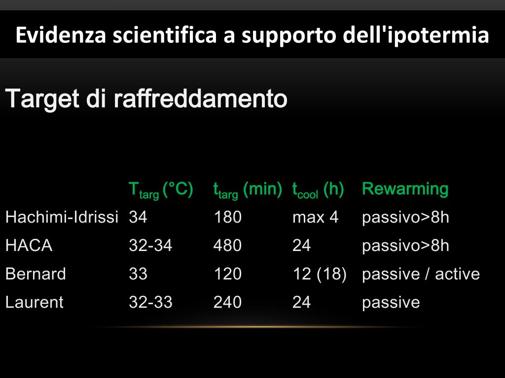 Target di raffreddamento Ttarg(°C) ttarg (min) tcool (h) Rewarming Hachimi-Idrissi 34 180max 4passivo>8h HACA 32-34 48024passivo>8h Bernard 33 12012 (18)passive / active Laurent 32-33 240 24 passive Evidenzascientifica a supportodell'ipotermia Evidenza scientifica a supporto dell'ipotermia