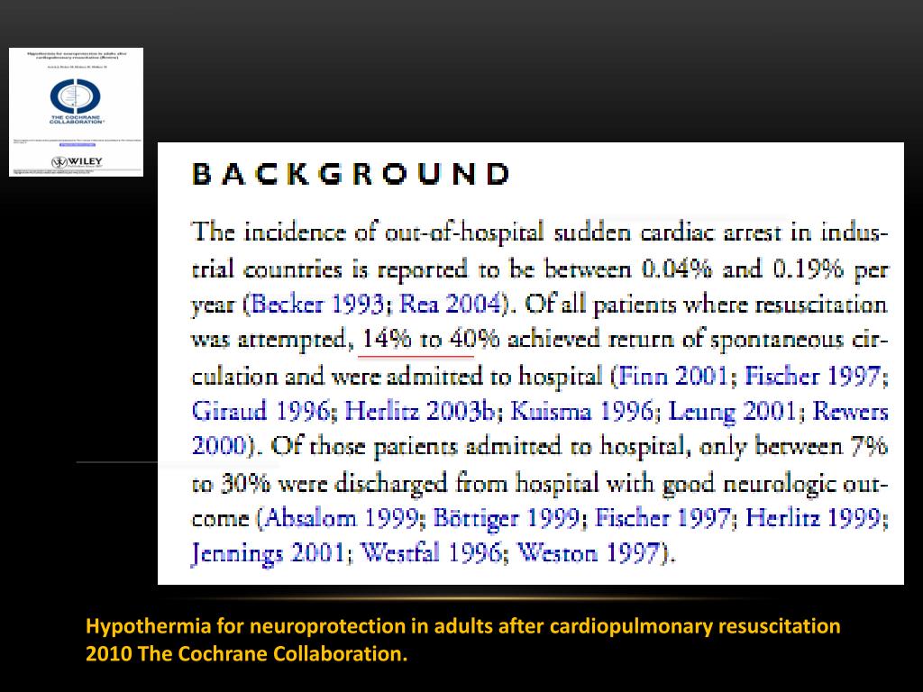 Hypothermia for neuroprotection in adults after cardiopulmonary resuscitation 2010 The Cochrane Collaboration.