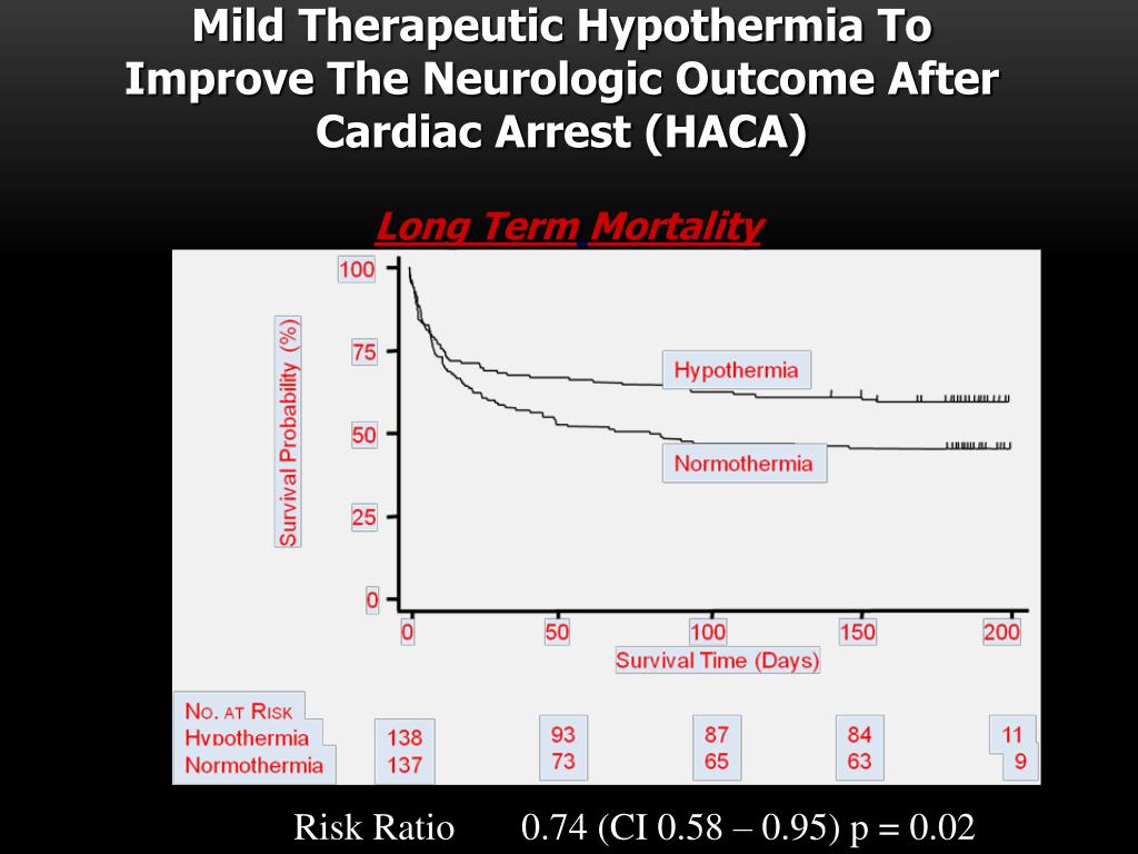 Mild Therapeutic Hypothermia To Improve The Neurologic Outcome After Cardiac Arrest (HACA) Long TermMortality Risk Ratio 0.74 (CI 0.58 – 0.95) p = 0.02