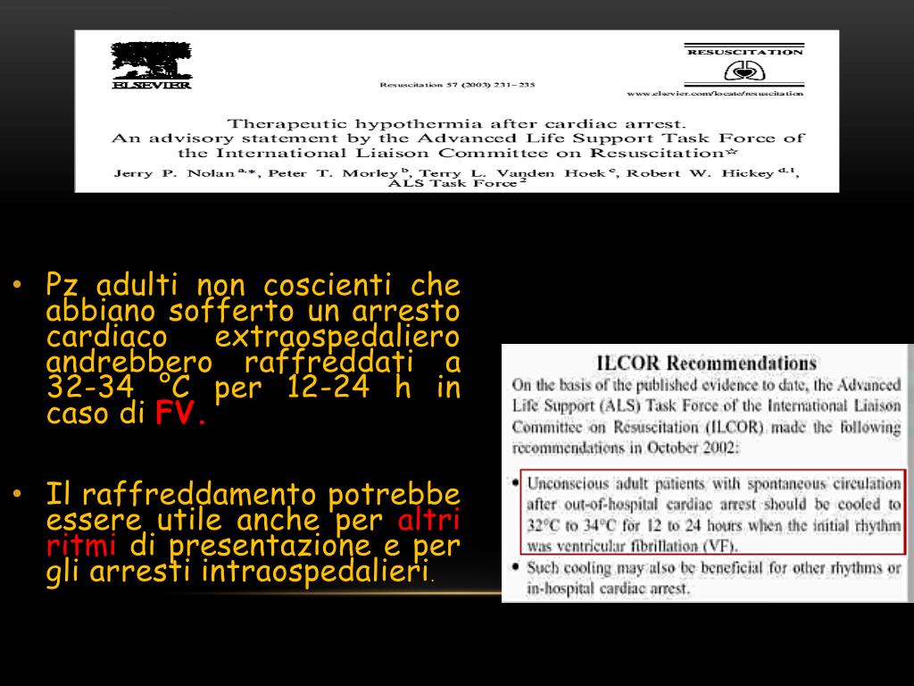 Pz adulti non coscienti che abbiano sofferto un arresto cardiaco extraospedaliero andrebbero raffreddati a 32-34 °C per 12-24 h in caso di FV. Il raffreddamento potrebbe essere utile anche per altri ritmi di presentazione e per gli arresti intraospedalieri.