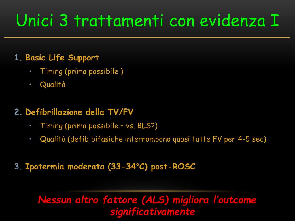 Unici 3 trattamenti con evidenza I • Basic Life Support • Timing (prima possibile ) • Qualità • Defibrillazione della TV/FV • Timing (prima possibile – vs. BLS?) • Qualità (defib bifasiche interrompono quasi tutte FV per 4-5 sec) • Ipotermia moderata (33-34°C) post-ROSC Nessun altro fattore (ALS) migliora l’outcome significativamente