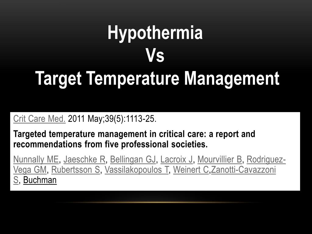 Hypothermia Vs Target Temperature Management Crit Care Med. 2011 May;39(5):1113-25. Targeted temperature management in critical care: a report and recommendations from fiveprofessional societies. Nunnally ME, Jaeschke R, Bellingan GJ, Lacroix J, Mourvillier B, Rodriguez-Vega GM, Rubertsson S, Vassilakopoulos T, WeinertC,Zanotti-Cavazzoni S, Buchman