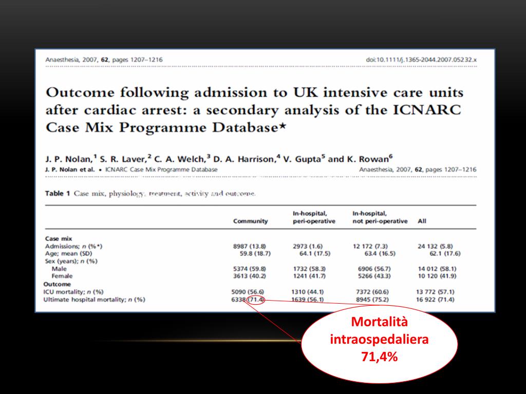 Rosomoff HL et al. Am J Physiol 1954;179:85-88 Nilsson L et AL ActaAnaesthesiolScand 1975;19:199-205 Mortalità intraospedaliera 71,4%