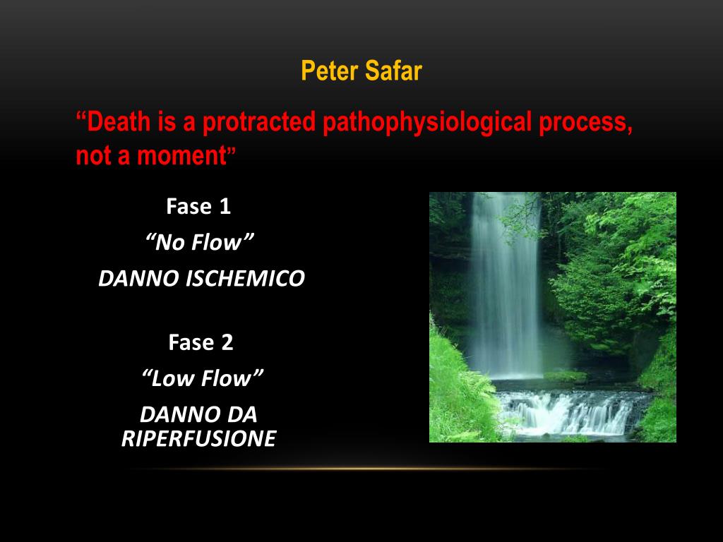 Peter Safar “Death is a protracted pathophysiological process, not a moment” Fase 1 “No Flow” DANNO ISCHEMICO Fase 2 “Low Flow” DANNO DA RIPERFUSIONE