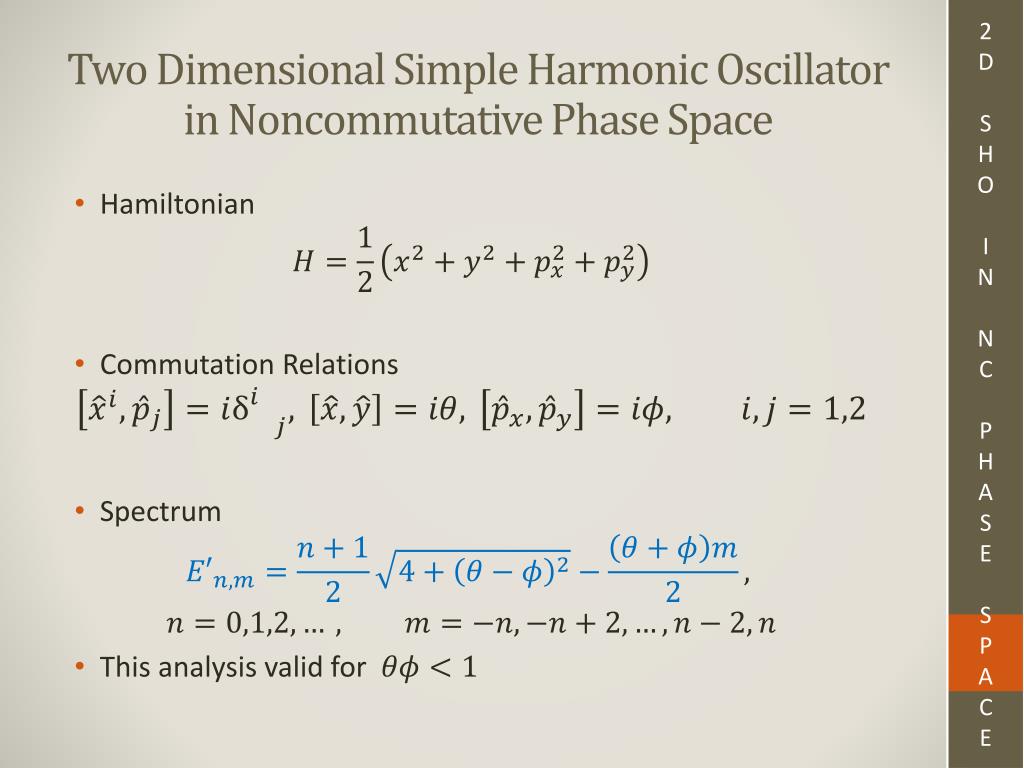 Two Dimensional Simple Harmonic Oscillator in Noncommutative Phase Space • Hamiltonian • Commutation Relations • Spectrum • This analysis valid for