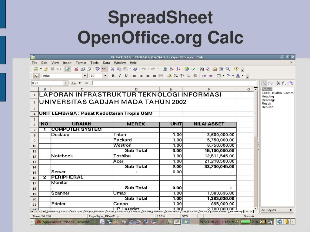 Langkah menuju Opensource (1) • Komputer yang pengadaannya belum termasuk program aplikasi Microsoft Office dilengkapi dengan OpenOffice.org • Komputer yang pengadaannya belum termasuk sistem operasi Microsoft Windows dilengkapi dengan sistem operasi Linux • Penguna yang menghendaki namun belum memiliki software statistik akan diberi software R-Base.