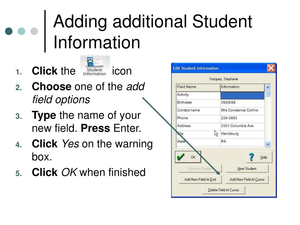 Adding additional Student Information • Click the icon • Choose one of the add field options • Type the name of your new field. Press Enter. • ClickYes on the warning box. • ClickOK when finished
