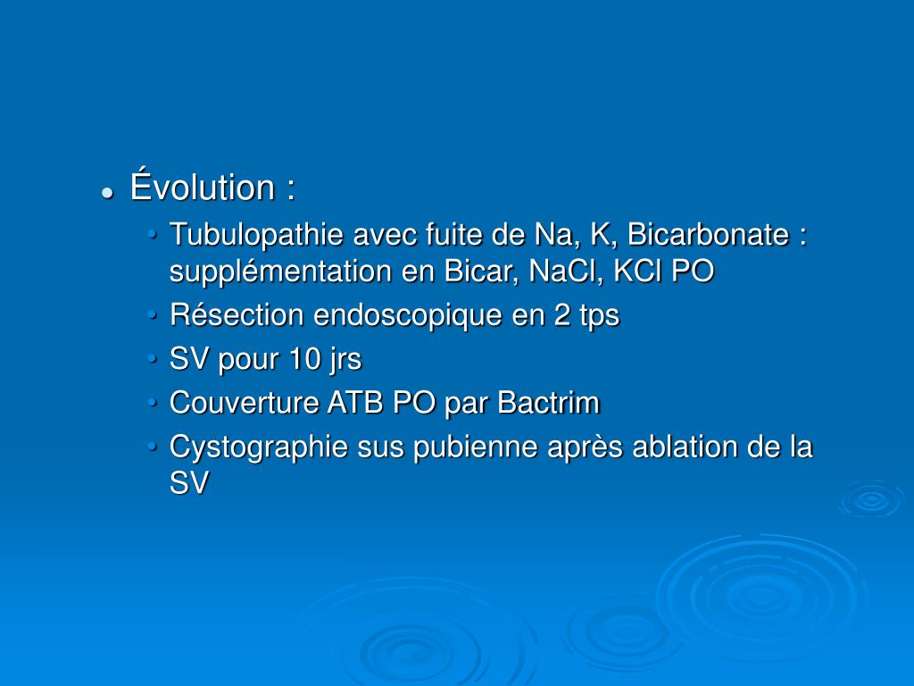 Évolution : • Tubulopathie avec fuite de Na, K, Bicarbonate : supplémentation en Bicar, NaCl, KCl PO • Résection endoscopique en 2 tps • SV pour 10 jrs • Couverture ATB PO par Bactrim • Cystographie sus pubienne après ablation de la SV