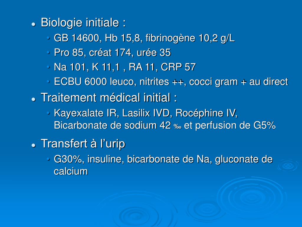 Biologie initiale : • GB 14600, Hb 15,8, fibrinogène 10,2 g/L • Pro 85, créat 174, urée 35 • Na 101, K 11,1 , RA 11, CRP 57 • ECBU 6000 leuco, nitrites ++, cocci gram + au direct • Traitement médical initial : • Kayexalate IR, Lasilix IVD, Rocéphine IV, Bicarbonate de sodium 42 ‰ et perfusion de G5% • Transfert à l’urip • G30%, insuline, bicarbonate de Na, gluconate de calcium