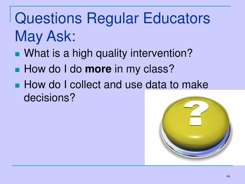 Questions Regular Educators May Ask: • What is a high quality intervention? • How do I do more in my class? • How do I collect and use data to make decisions?