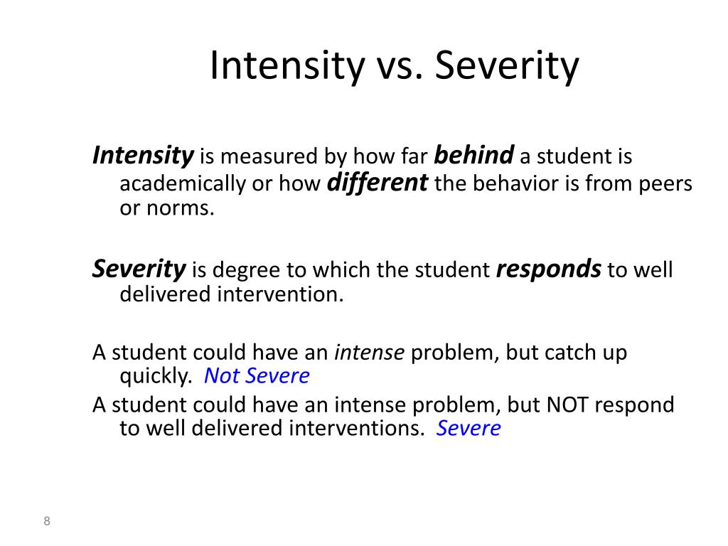 Intensity vs. Severity Intensityis measured by how far behind a student is academically or how different the behavior is from peers or norms. Severity is degree to which the student respondsto well delivered intervention. A student could have an intense problem, but catch up quickly. Not Severe A student could have an intense problem, but NOT respond to well delivered interventions. Severe