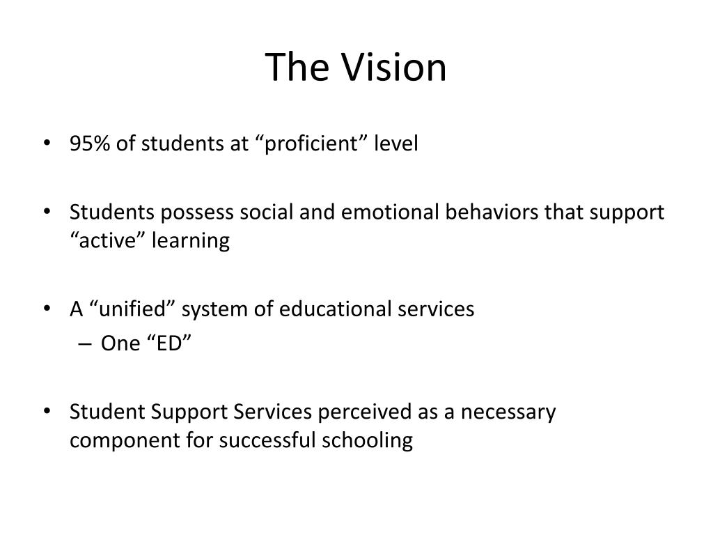 The Vision • 95% of students at “proficient” level • Students possess social and emotional behaviors that support “active” learning • A “unified” system of educational services • One “ED” • Student Support Services perceived as a necessary component for successful schooling
