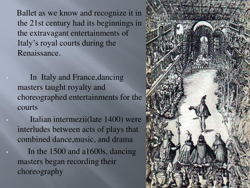 Ballet as we know and recognize it in the 21st century had its beginnings in the extravagant entertainments of Italy’s royal courts during the Renaissance. • In Italy and France,dancing masters taught royalty and choreographed entertainments for the courts • Italian intermezii(late 1400) were interludes between acts of plays that combined dance,music, and drama • In the 1500 and a1600s, dancing masters began recording their choreography