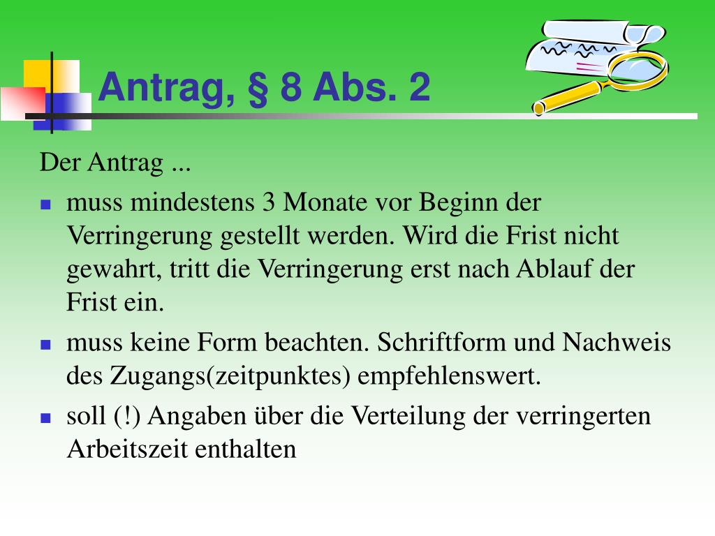Antrag, § 8 Abs. 2 Der Antrag ... • muss mindestens 3 Monate vor Beginn der Verringerung gestellt werden. Wird die Frist nicht gewahrt, tritt die Verringerung erst nach Ablauf der Frist ein. • muss keine Form beachten. Schriftform und Nachweis des Zugangs(zeitpunktes) empfehlenswert. • soll (!) Angaben über die Verteilung der verringerten Arbeitszeit enthalten