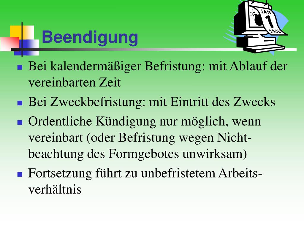 Beendigung • Bei kalendermäßiger Befristung: mit Ablauf der vereinbarten Zeit • Bei Zweckbefristung: mit Eintritt des Zwecks • Ordentliche Kündigung nur möglich, wenn vereinbart (oder Befristung wegen Nicht-beachtung des Formgebotes unwirksam) • Fortsetzung führt zu unbefristetem Arbeits-verhältnis