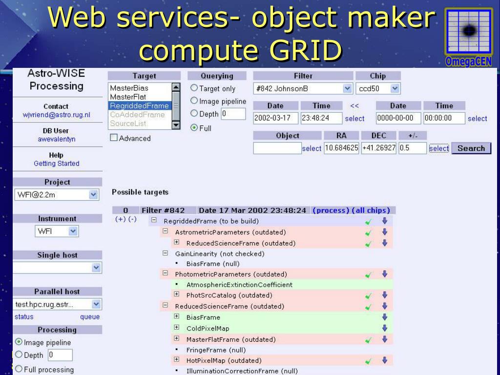 Instrument: e-science = share resources beyond workstation • Compute power: • AstroWise grid (RuG, Leiden, MPE, Bonn, INAF) • EGEE-3 • Storage: • AstroWise fileservers (Leiden, RuG, Nijmegen, MPE, Bonn, INAF) • BiG GRID (RuG- NikHef- SARA) • Database: all meta + calibration +source data • AstroWise - Oracle • Application programs + doc’s • Web services • Interoperability: EGEE- EURO-VO