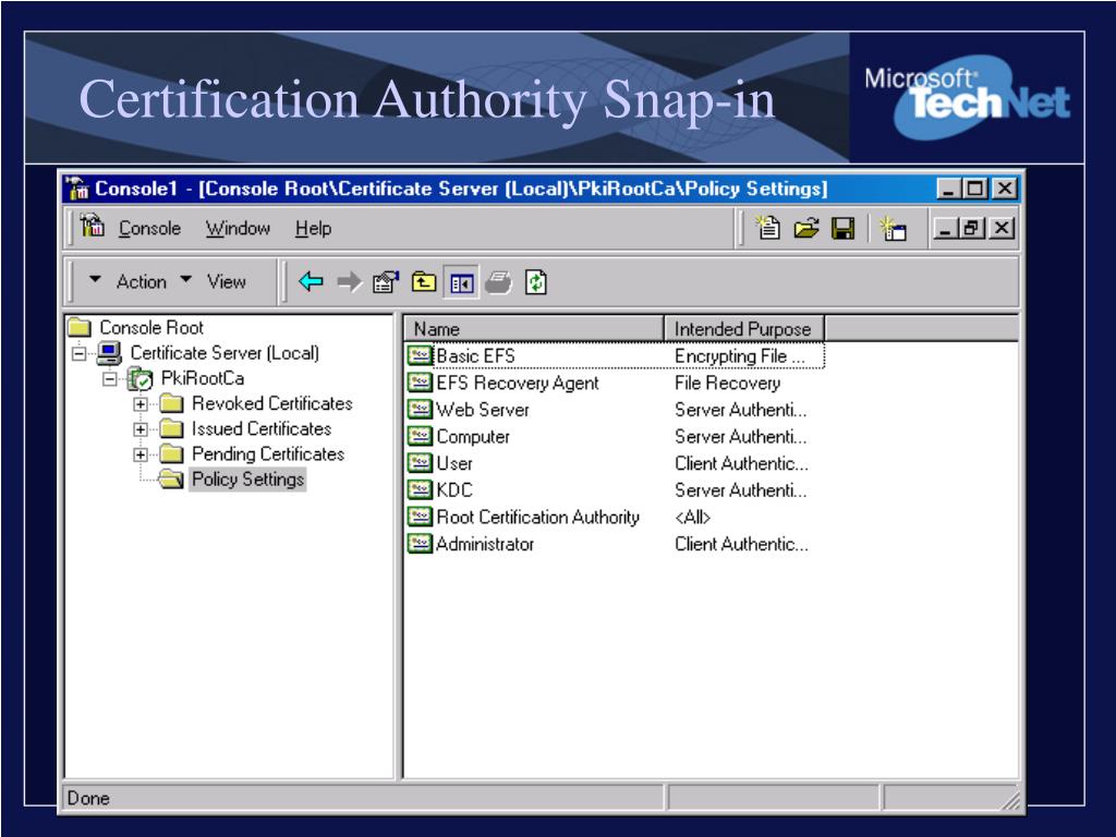 Arquitectura de Seguridad • Infraestructura de clave pública (PKI) • CryptoAPI • Servicio de Autoridad Certificante • Sistema de archivos encriptado • Smart Card