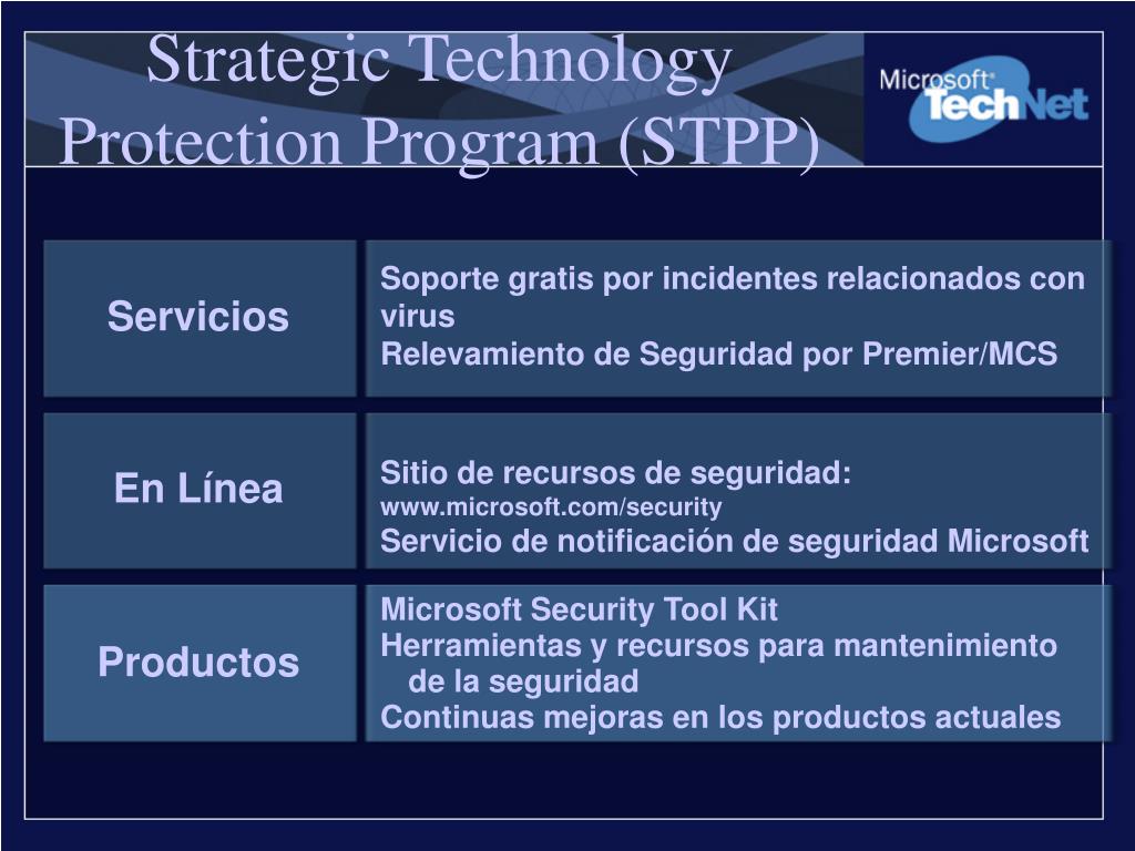 Strategic Technology Protection Program (STPP) Servicios Soporte gratis por incidentes relacionados con virus Relevamiento de Seguridad por Premier/MCS • Sitio de recursos de seguridad: www.microsoft.com/security • Servicio de notificación de seguridad Microsoft En Línea Productos Microsoft Security Tool Kit Herramientas y recursos para mantenimiento de la seguridad Continuas mejoras en los productos actuales