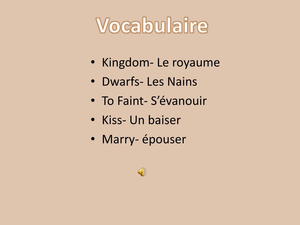Vocabulaire • Kingdom- Le royaume • Dwarfs- Les Nains • To Faint- S’évanouir • Kiss- Un baiser • Marry- épouser