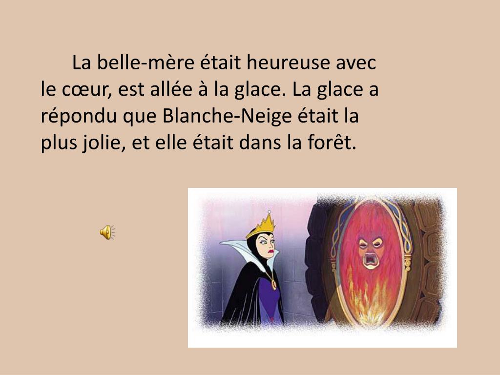 La belle-mère avait une glace magique, et tous les jours elle demandait ‘La glace, la glace, sur le mur. Qui est la plus jolie de toutes les femmes?’ La glace répondait qu’elle était la plus jolie. Jusqu’à un jour, la glace a répondu que sa belle-fille, Blanche-Neige, était la plus jolie des toutes les femmes.