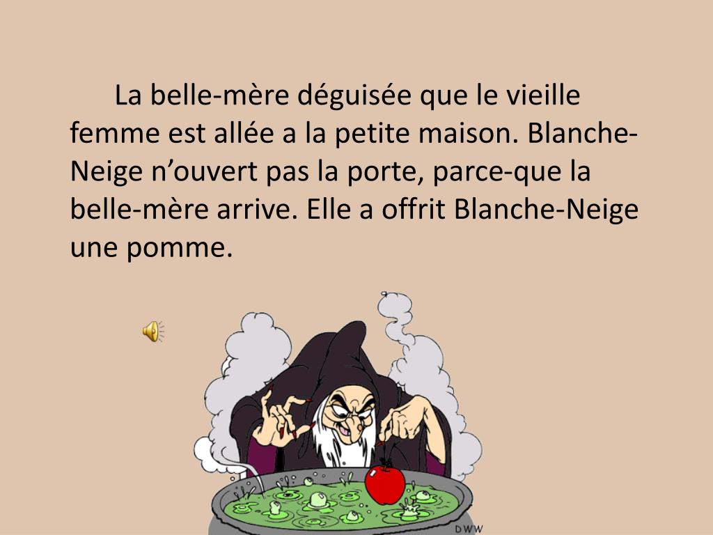 La belle-mère déguisée que le vieille femme est allée a la petite maison. Blanche-Neige n’ouvert pas la porte, parce-que la belle-mère arrive. Elle a offrit Blanche-Neige une pomme.