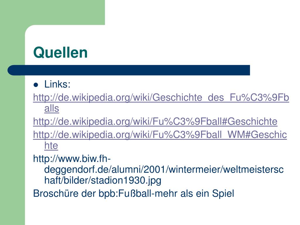 Quellen • Links: http://de.wikipedia.org/wiki/Geschichte_des_Fu%C3%9Fballs http://de.wikipedia.org/wiki/Fu%C3%9Fball#Geschichte http://de.wikipedia.org/wiki/Fu%C3%9Fball_WM#Geschichte http://www.biw.fh-deggendorf.de/alumni/2001/wintermeier/weltmeisterschaft/bilder/stadion1930.jpg Broschüre der bpb:Fußball-mehr als ein Spiel
