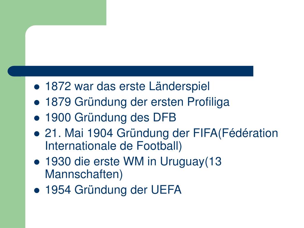 1872 war das erste Länderspiel • 1879 Gründung der ersten Profiliga • 1900 Gründung des DFB • 21. Mai 1904 Gründung der FIFA(Fédération Internationale de Football) • 1930 die erste WM in Uruguay(13 Mannschaften) • 1954 Gründung der UEFA
