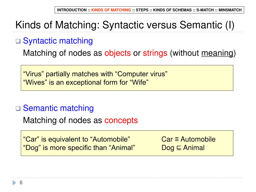 Kinds of Matching: Syntactic versus Semantic (I) INTRODUCTION :: KINDS OF MATCHING :: STEPS :: KINDS OF SCHEMAS :: S-MATCH :: MINSMATCH • Syntactic matching Matching of nodes as objects or strings (without meaning) “Virus” partially matches with “Computer virus” “Wives” is an exceptional form for “Wife” • Semantic matching Matching of nodes as concepts “Car” is equivalent to “Automobile” Car ≡ Automobile “Dog” is more specific than “Animal” Dog ⊑ Animal