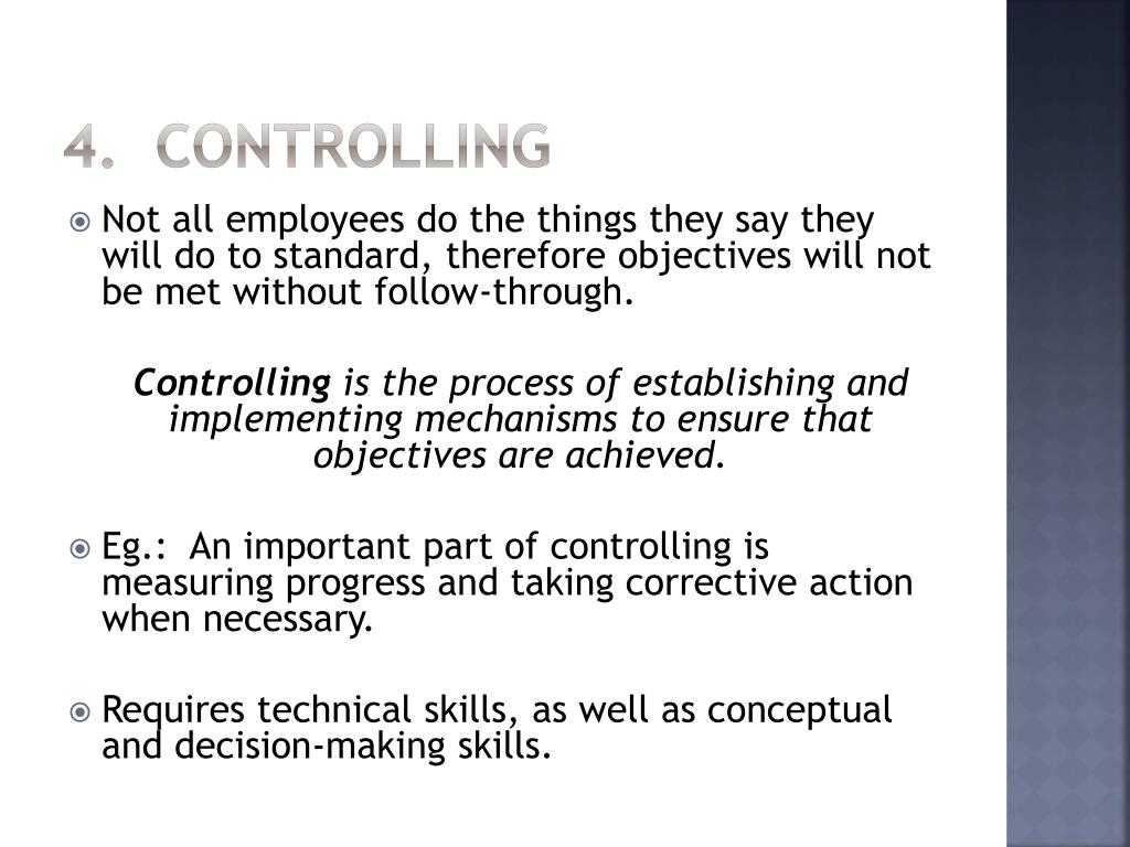 4. controlling • Not all employees do the things they say they will do to standard, therefore objectives will not be met without follow-through. Controlling is the process of establishing and implementing mechanisms to ensure that objectives are achieved. • Eg.: An important part of controlling is measuring progress and taking corrective action when necessary. • Requires technical skills, as well as conceptual and decision-making skills.