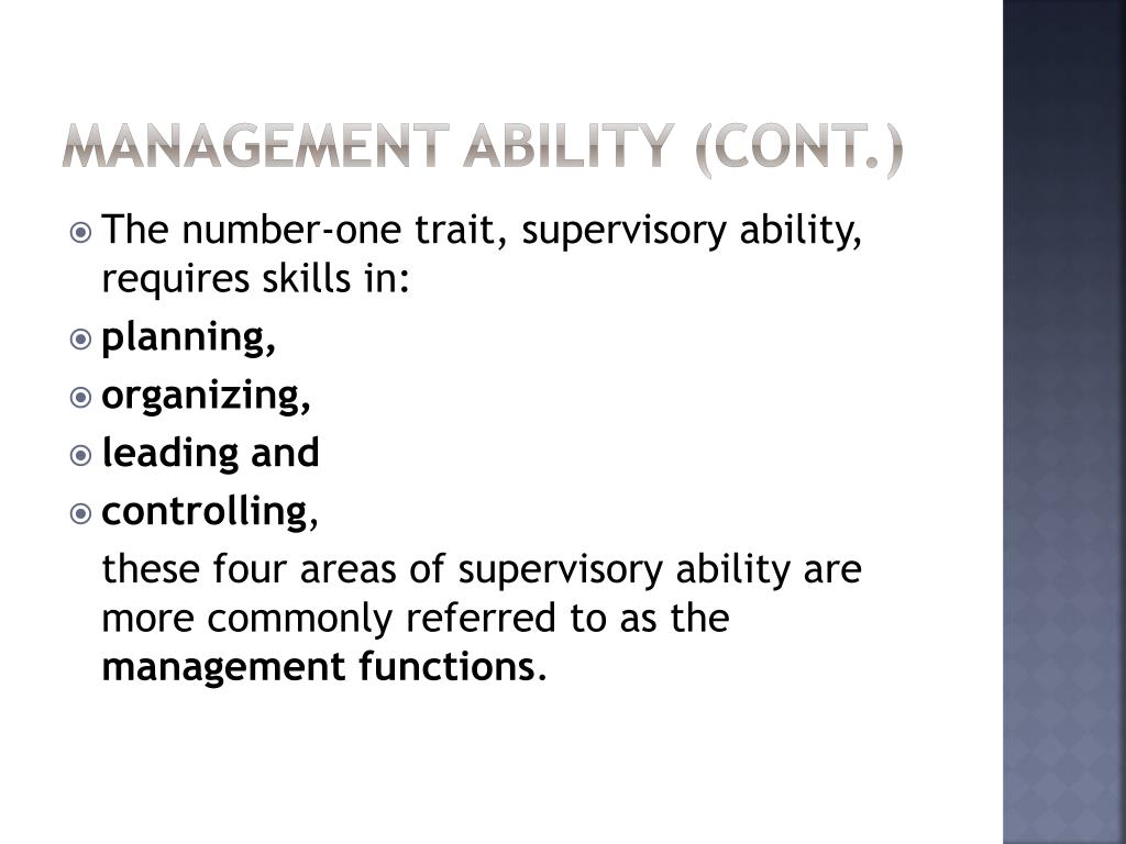 Management ability (cont.) • The number-one trait, supervisory ability, requires skills in: • planning, • organizing, • leading and • controlling, these four areas of supervisory ability are more commonly referred to as the management functions.