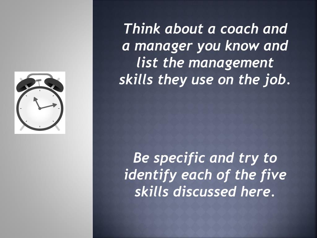 Think about a coach and a manager you know and list the management skills they use on the job. Be specific and try to identify each of the five skills discussed here.