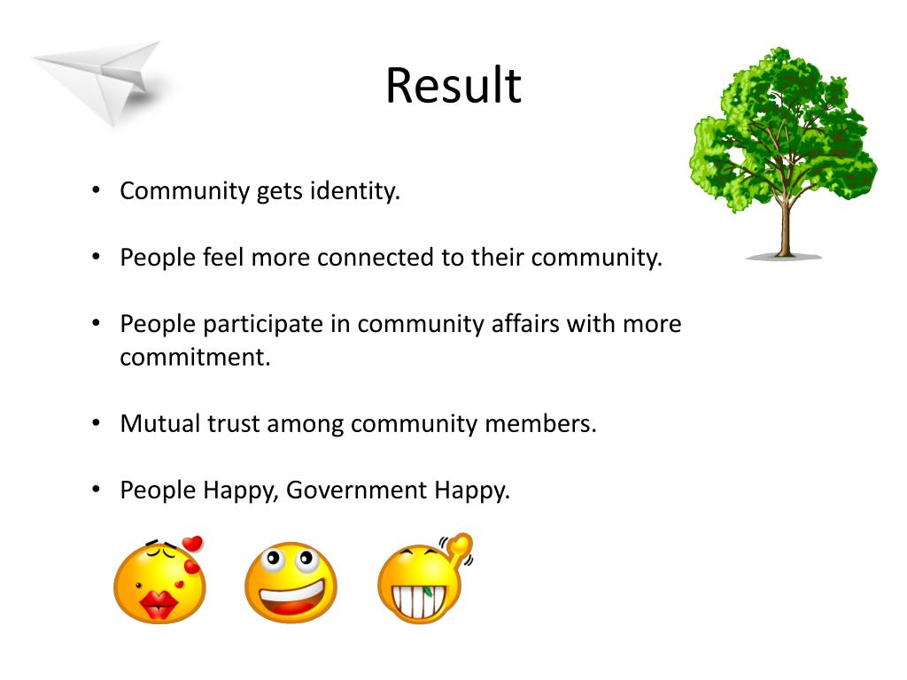 Result • Community gets identity. • People feel more connected to their community. • People participate in community affairs with more commitment. • Mutual trust among community members. • People Happy, Government Happy.
