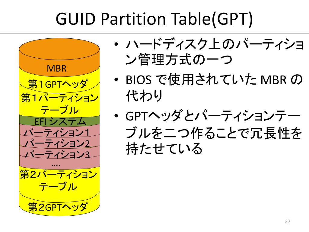 GUID Partition Table(GPT) • ハードディスク上のパーティション管理方式の一つ • BIOS で使用されていた MBR の代わり • GPTヘッダとパーティションテーブルを二つ作ることで冗長性を持たせている MBR 第1GPTヘッダ 第1パーティションテーブル EFI システム パーティション1 パーティション2 パーティション3 …. 第2パーティションテーブル 第2GPTヘッダ