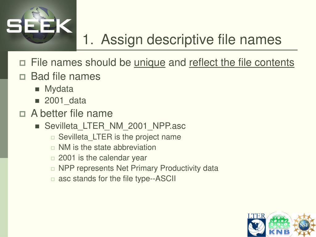 1. Assign descriptive file names • File names should be unique and reflect the file contents • Bad file names • Mydata • 2001_data • A better file name • Sevilleta_LTER_NM_2001_NPP.asc • Sevilleta_LTER is the project name • NM is the state abbreviation • 2001 is the calendar year • NPP represents Net Primary Productivity data • asc stands for the file type--ASCII