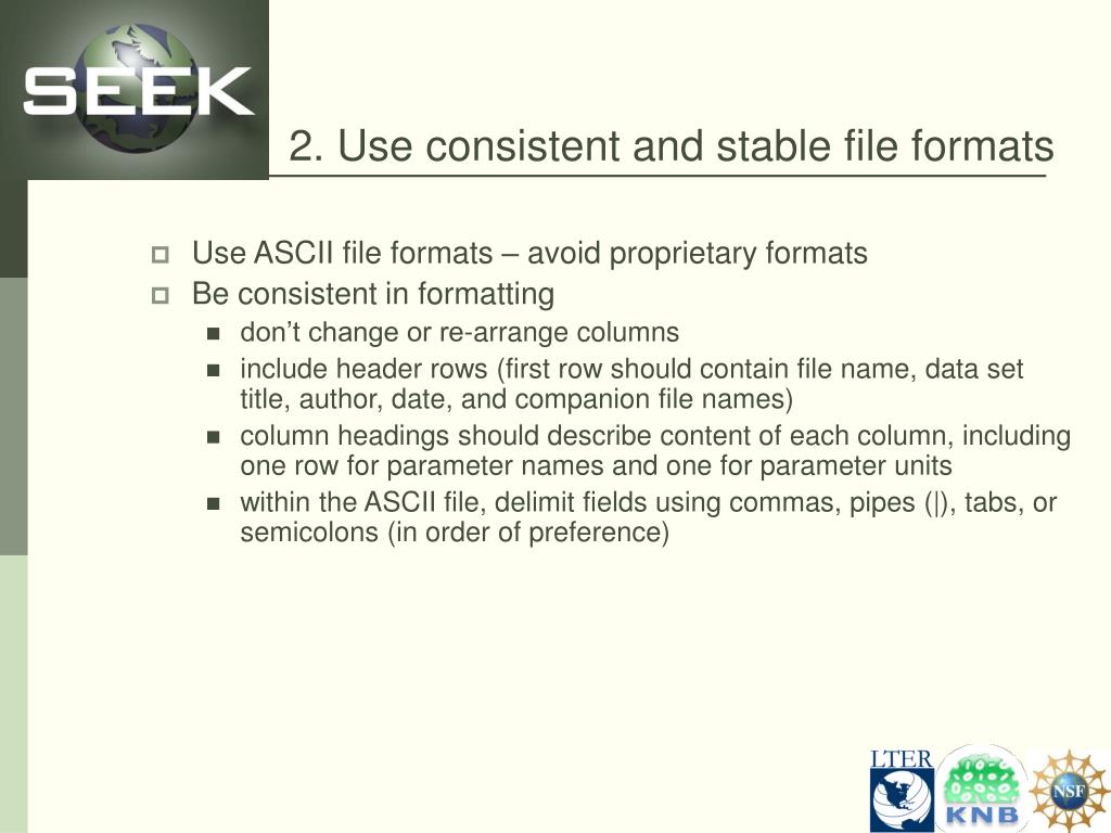 2. Use consistent and stable file formats • Use ASCII file formats – avoid proprietary formats • Be consistent in formatting • don’t change or re-arrange columns • include header rows (first row should contain file name, data set title, author, date, and companion file names) • column headings should describe content of each column, including one row for parameter names and one for parameter units • within the ASCII file, delimit fields using commas, pipes (|), tabs, or semicolons (in order of preference)
