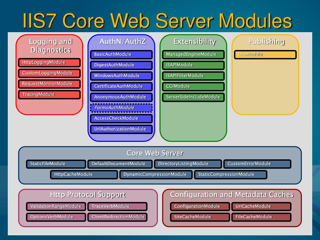 IIS7 Core Web Server Modules Logging and Diagnostics AuthN/AuthZ Extensibility Publishing BasicAuthModule ManagedEngineModule DavModule HttpLoggingModule DigestAuthModule ISAPIModule CustomLoggingModule WindowsAuthModule ISAPIFilterModule RequestMonitorModule CertificateAuthModule CGIModule TracingModule AnonymousAuthModule ServerSideIncludeModule FormsAuthModule AccessCheckModule UrlAuthorizationModule Core Web Server DirectoryListingModule CustomErrorModule StaticFileModule DefaultDocumentModule HttpCacheModule DynamicCompressionModule StaticCompressionModule Http Protocol Support Configuration and Metadata Caches ValidationRangeModule TraceVerbModule ConfigurationModule UriCacheModule OptionsVerbModule ClientRedirectionModule SiteCacheModule FileCacheModule