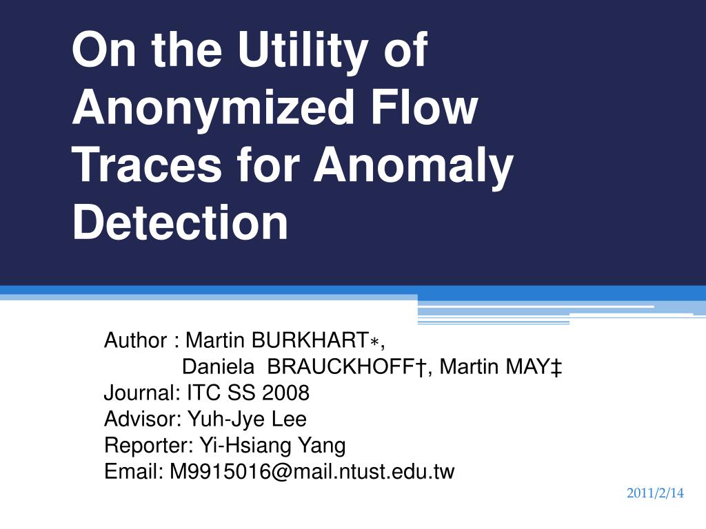 On the Utility of Anonymized Flow Traces for Anomaly Detection Author : Martin BURKHART∗, Daniela BRAUCKHOFF†, Martin MAY‡ Journal: ITC SS 2008 Advisor: Yuh-Jye Lee Reporter: Yi-Hsiang Yang Email: M9915016@mail.ntust.edu.tw