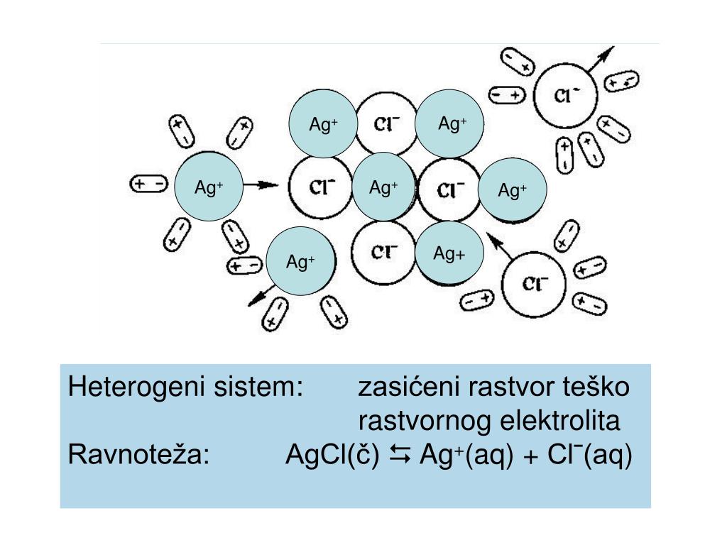 Ag+ Ag+ Ag+ Ag+ Ag+ Ag+ Ag+ Heterogeni sistem: zasićeni rastvor teško rastvornog elektrolita Ravnoteža: AgCl(č) Ag+(aq) + Clˉ(aq)