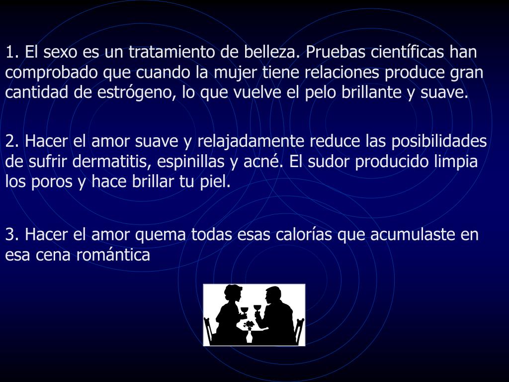 1. El sexo es un tratamiento de belleza. Pruebas científicas han comprobado que cuando la mujer tiene relaciones produce gran cantidad de estrógeno, lo que vuelve el pelo brillante y suave. 2. Hacer el amor suave y relajadamente reduce lasposibilidades desufrir dermatitis, espinillas y acné. El sudor producido limpia losporos y hace brillar tu piel. 3. Hacer el amor quema todas esas calorías que acumulaste en esacena romántica