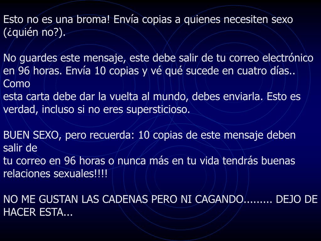 Esto no es una broma! Envía copias a quienes necesiten sexo (¿quién no?). No guardes este mensaje, este debe salir de tu correo electrónico en 96 horas. Envía 10 copias y vé qué sucede en cuatro días.. Como esta carta debe dar la vuelta al mundo, debes enviarla. Esto es verdad, incluso si no eres supersticioso. BUEN SEXO, pero recuerda: 10 copias de este mensaje deben salir de tu correo en 96 horas o nunca más en tu vida tendrás buenas relaciones sexuales!!!! NO ME GUSTAN LAS CADENAS PERO NI CAGANDO......... DEJO DE HACER ESTA...