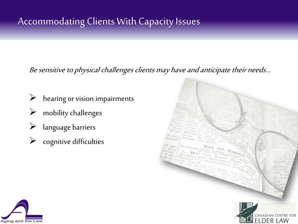 Be sensitive to physical challenges clients may have and anticipate their needs… hearing or vision impairments mobility challenges language barriers cognitive difficulties Accommodating Clients With Capacity Issues