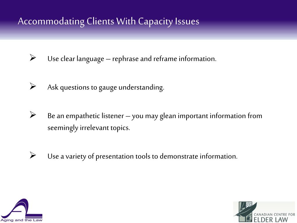 Accommodating Clients With Capacity Issues Use clear language – rephrase and reframe information. Ask questions to gauge understanding. Be an empathetic listener – you may glean important information from seemingly irrelevant topics. Use a variety of presentation tools to demonstrate information.