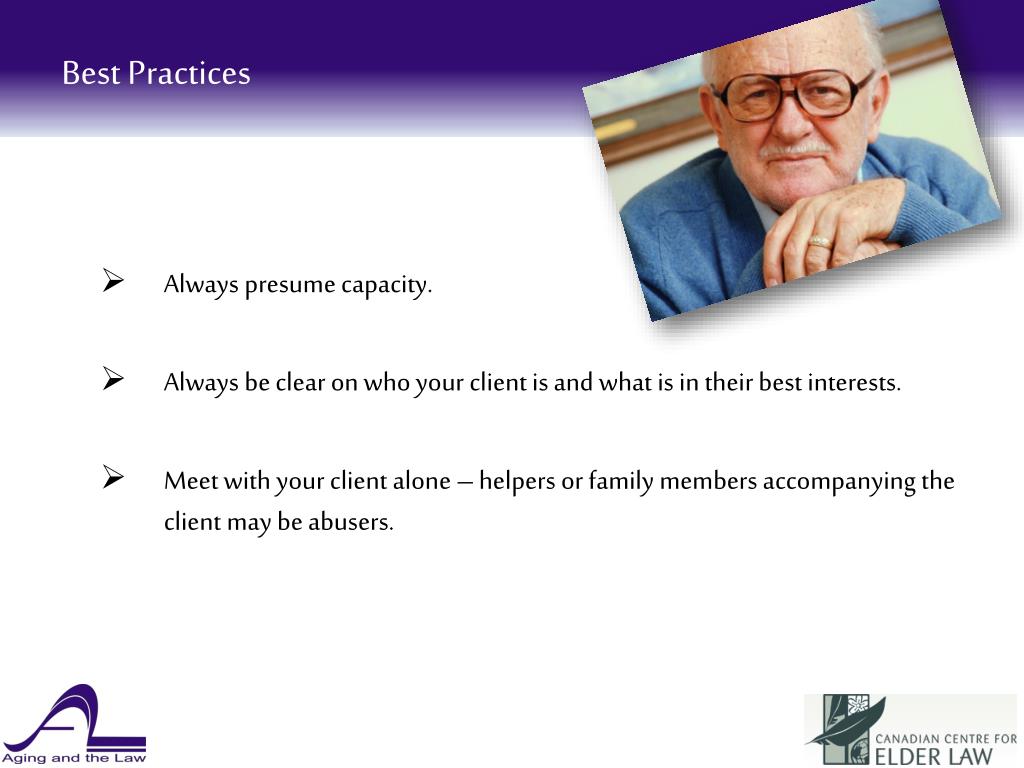 Best Practices Always presume capacity. Always be clear on who your client is and what is in their best interests. Meet with your client alone – helpers or family members accompanying the client may be abusers.
