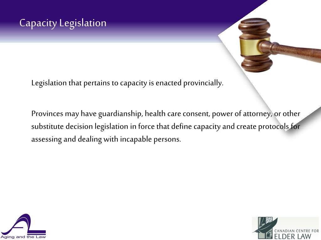 Capacity Legislation Legislation that pertains to capacity is enacted provincially. Provinces may have guardianship, health care consent, power of attorney, or other substitute decision legislation in force that define capacity and create protocols for assessing and dealing with incapable persons.